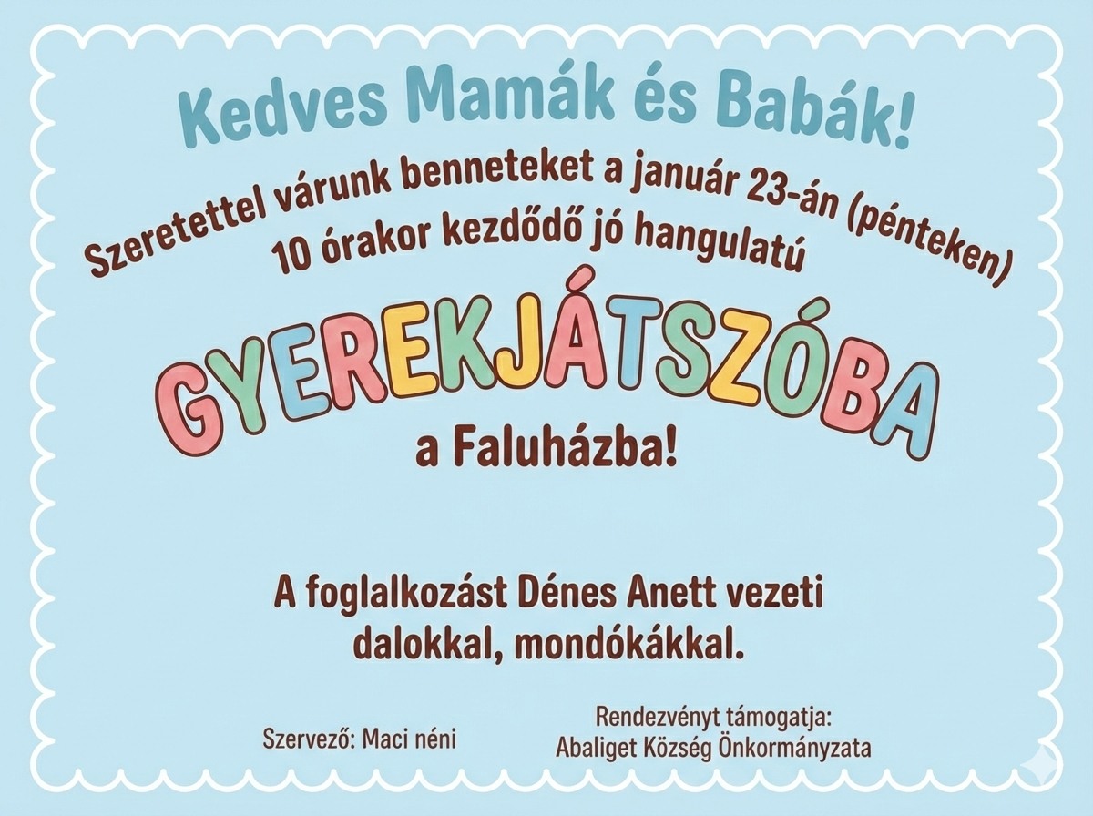2026. január 23-án, pénteken 10 órakor Dénes Anett vezetésével gyerekjátszó lesz az Abaligeti Faluházban.