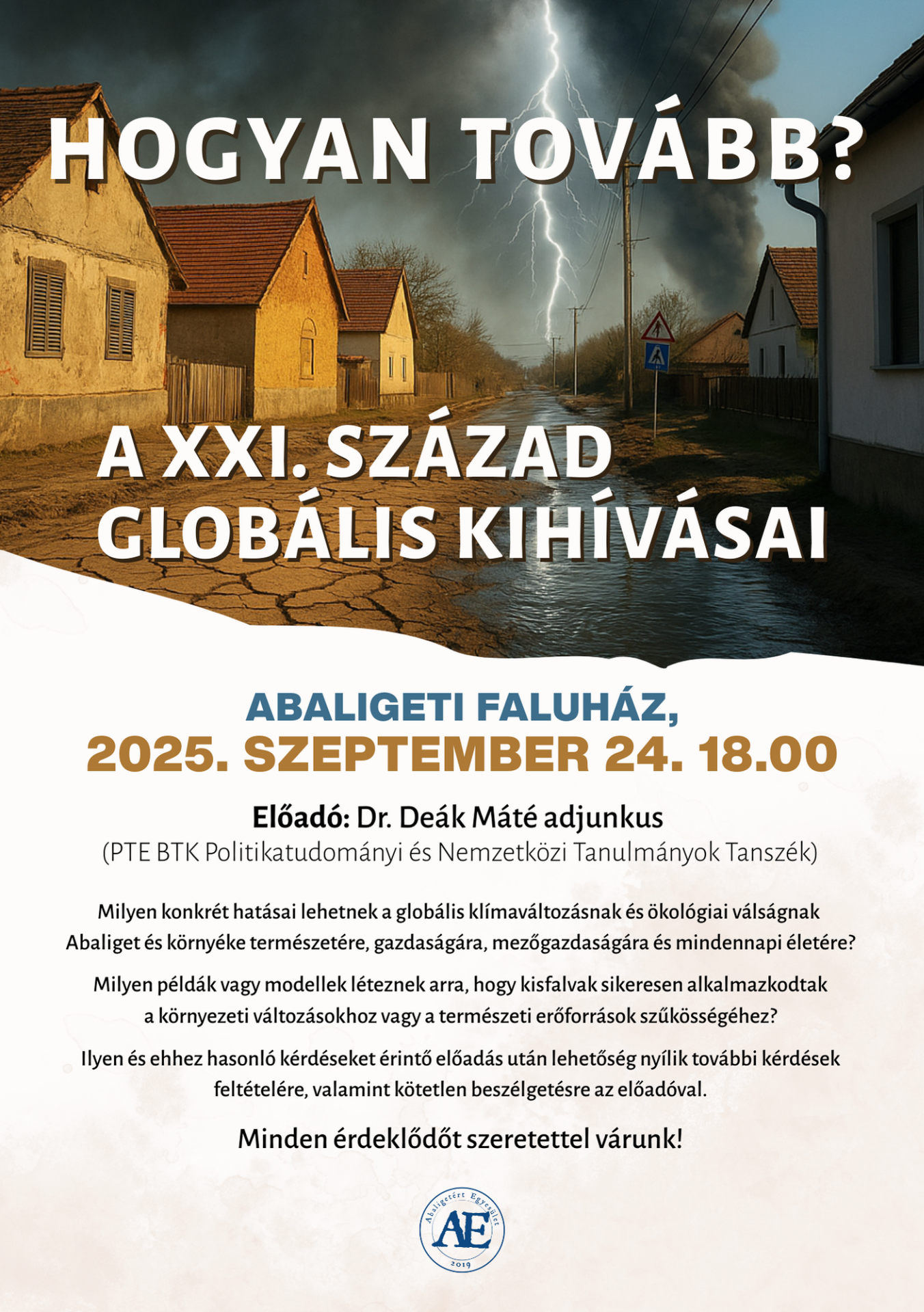 Hogyan tovább? A XXI. század globális kihívásai - Előadás és beszélgetés az Abaligeti Faluházban